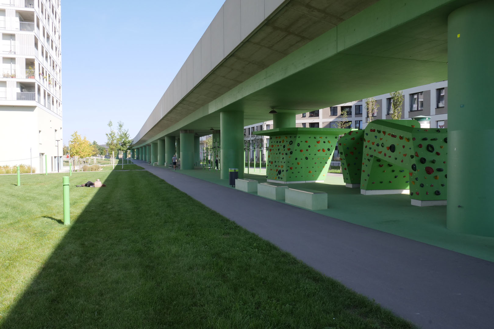 Seestadt Aspern est un de ces quartier. Situé à environ 7 km du centre-ville de Vienne, il est actuellement l’un des plus grands projets de développement urbain en Europe avec plus de 20 000 habitants attendus d’ici 2028, et autant d’emplois. Et ou se cache l’innovation ? Dans le modèle de développement poussé ici : l’idée est de limiter les usages purement résidentiels ou commerciaux, au profit de plus de mixité fonctionnelle. Le tout avec des gestes urbains et architecturaux les plus diversifiés possibles, afin d’éviter le coté trop lisse, souvent observé dans ces quartiers. Dans la manière de concevoir les bâtiments, avec par exemple, le HoHo Wien, le plus haut gratte-ciel du monde… sur structure bois.